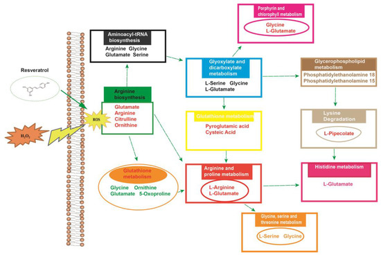 The metabolic pathway analysis data are shown as a bar chart and a bubble chart in Figure 9. According to the KEGG enrichment analysis of differentially expressed metabolites, 25 differentially expressed metabolite pathways were enriched: urea cycle, arginine and proline metabolism, glycine and serine metabolism, ammonia recycling, aspartate metabolism, glutathione metabolism, etc. (p < 0.05). The influence of the path is mainly concentrated in arginine biosynthesis, glutathione metabolism, aminoacyl-tRNA biosynthesis, glyoxylate and dicarboxylate metabolism, arginine and proline metabolism, glycine, serine and threonine metabolism, and D-glutamine and D-glutamate metabolism. The above results show that the oxidative injury induced by H2O2 caused metabolic disorder, and resveratrol could effectively regulate this imbalance (Figure 10).