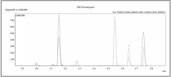 The method’s parameters were applied as described in Method Validation Parameters (Section 4.4). The result showed an increase in signal intensity by approximately 4, 10, and 14 times for leuprorelin, leuprorelin (5-9), and triptorelin, respectively (Figure 2). Figure 3 shows the chromatograms of the ion transitions of three standard compounds (2 ng/mL each) and the internal standard. The chromatogram showed no interference peaks at the retention times (RTs) of the analytes and internal standard.