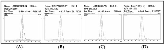 Chromatograms of leuprorelin and leuprorelin (5-9) from the urine of a prostate cancer patient collected 3 h after drug administration. (A,B) show the chromatograms of leuprorelin without and with DMSO in the mobile phase. (C,D) show the chromatograms of leuprorelin (5-9). The peak area is shown in the upper–right corner of each window. The results show 4-fold and 10-fold increases in the intensities of leuprorelin and leuprorelin (5-9) (DMSO = dimethyl sulfoxide), respectively.