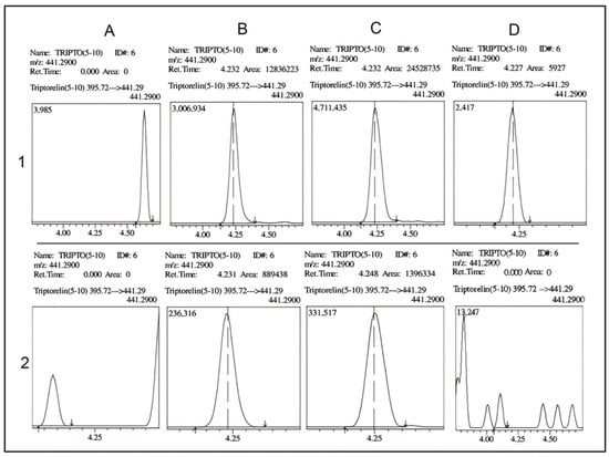 In the presence of DMSO, the chromatograms indicated the presence of in vivo triptorelin (5-10) in all urine samples collected 3 h, 6 h, and 1 month after drug administration (Figure 5(1B–1D)). Without DMSO, triptorelin (5-10) was detected in lower concentrations in collected urine (Figure 5(2B,2C)), and the detection after one month of drug administration could not be achieved (Figure 5(2D)). As shown in Figure 5, the addition of DMSO to mobile phase A increased the intensities of both triptorelin and triptorelin (5-10). The 14-fold increase in triptorelin intensity is consistent with validation results (as in Figure 2).