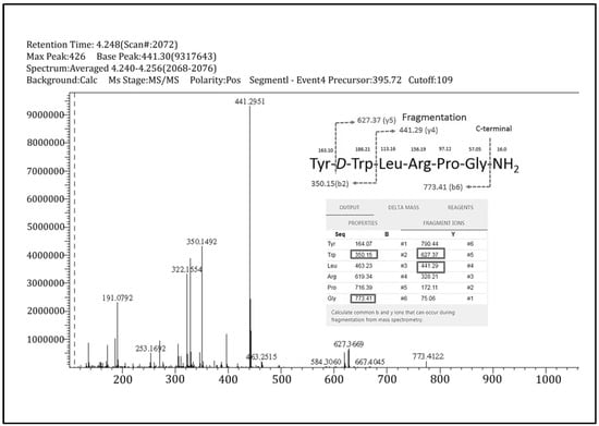 The mass spectrum of triptorelin (5-10) for precursor ion m/z 395.72 ([M + 2H]2+). The major fragments were m/z 441.29, 350.15, 627.37, and 773.41, which were identified as y4, b2, y5, and b6 ions. The amino acid sequence and proposed fragmentation scheme were compared with the Peptide Calculator’s result. The fragmentation of in vivo triptorelin (5-10) was proposed based on bottom-up mass spectrometry analysis.
