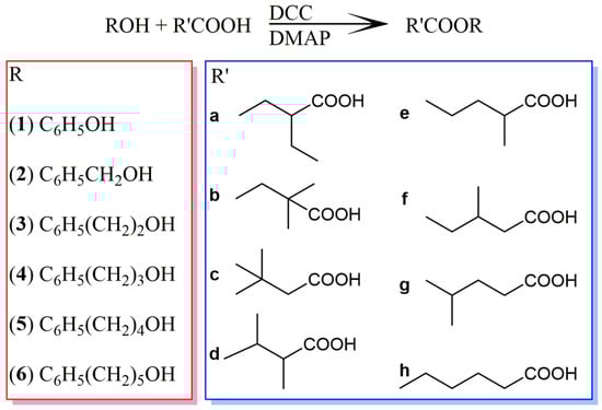 A solution of the appropriate alcohol (phenol (1), phenylmethanol (2), 2-phenylethanol (3), 3-phenylpropan-1-ol (4), 4-phenylbutan-1-ol (5), and 5-phenylpentan-1-ol (6)), carboxylic acid (1.1 eq; 2-ethylbutanoic (a), 2,2-dimethylbutanoic (b), 3,3-dimethylbutanoic (c), 2,3-dimethylbutanoic (d), 2-methylpentanoic (e), 3-methylpentanoic (f), 4-methylpentanoic (g), and hexanoic acid (h)), DMAP (0.3 eq) and DCC (1.1 eq) in 30 mL of dry DCM was stirred overnight, at room temperature, in a round bottom flask equipped with a CaCl2 guard tube. The precipitated urea was filtered off and the filtrate was concentrated under a vacuum. The resulting residue was purified by “dry-flash” chromatography using mixtures of hexane and Et2O of increasing polarity for elution. Esters were washed from the column with 10% (v/v) Et2O in hexane. The purity of the ester fractions was checked by TLC and GC-MS. The yield of the esterification step, spectral data (NMR, MS, and IR), and assignments of 1H and 13C signals for the synthesized esters are given below and in the Supplementary Materials (Figures S1–S144).