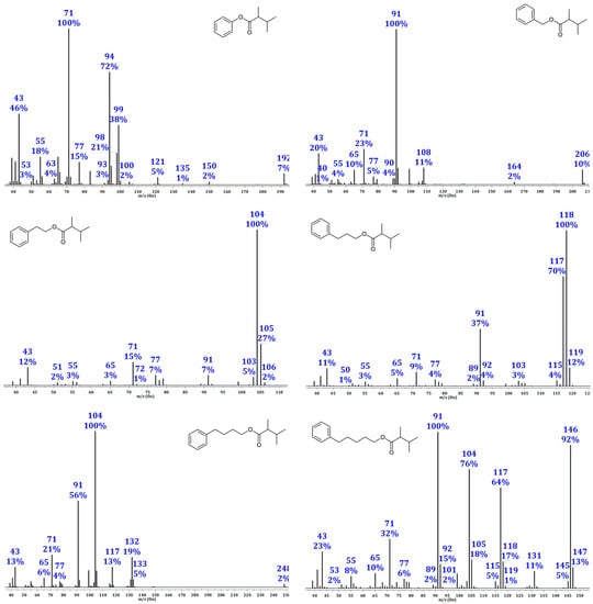 The mass fragmentation pattern in the spectra of esters of regioisomeric hexanoic acids with the same alcohol, which can be crucial for their identification based on MS spectra, was almost identical. For that reason, MS spectra can give only reliable data about the structure of alcohol whereas the identity of the acid part remains unknown. The lack of [M+] in mass spectra of phenethyl, 3-phenylpropyl, and 5-phenylpentyl esters makes the identification of such compounds even harder. In that case, acquiring RI data can significantly contribute to the identification of mentioned esters. For those reasons, the collection of the values of the experimentally determined retention indices for all synthesized esters was carried out using the two commonly used GC columns of different polarities (DB-5MS and HP-Innowax). These data were presented in Table 1.