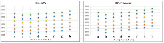 The dependence of RI values (DB-5MS and HP-Innowax columns) on the structure of the synthesized esters of 2-ethylbutanoic (a), 2,2-dimethylbutanoic (b), 3,3-dimethylbutanoic (c), 2,3-dimethylbutanoic (d), 2-methylpentanoic (e), 3-methylpentanoic (f), 4-methylpentanoic (g), and hexanoic acid (h).