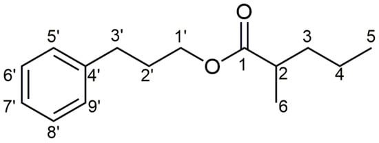 The structure of 3-phenylpropyl 2-methylpentanoate (4e) with the carbon atom numbering scheme.