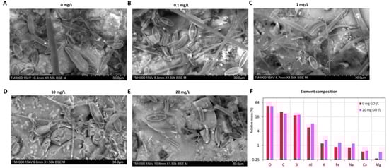 The SEM images of tiles (4 × 5 cm) with the biofilms exposed to different GO concentrations revealed no teratologies or alterations in size of the organisms visualized, predominantly diatom species (Figure 1A–E).