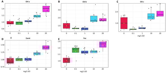 Photosynthetic pigment changes in biofilms exposed to GO (0 mg/L, 0.1 mg/L, 1 mg/L, 10 mg/L, and 20 mg/L). Results are expressed as variation relative to control (0 mg/L GO). (A) chlorophyll a (Chl a). (B) chlorophyll b (Chl b). (C) chlorophyll c (Chl c). (D) carotenoids (Carot). (E) fucoxanthin (Fuc). Values are means of three replicates + standard deviation. Significant differences compared with non-exposed biofilm (control) were marked with lowercase letters (p < 0.05). For means, standard errors, and statistical difference see Supplementary Table S1.