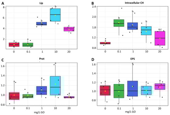 Effects of GO (0 mg/L, 0.1 mg/L, 1 mg/L, 10 mg/L, and 20 mg/L) on cellular metabolism of biofilms. Results expressed as variation relative to control (0 mg/L GO). (A) lipid content (Lip). (B) intracellular carbohydrates (Intracellular CH). (C) protein content (PROT). (D) Exopolysaccharides (EPSs). Values are means of three replicates + standard deviation. Significant differences compared with non-exposed biofilm (control) were marked with lowercase letters (p < 0.05). For means, standard errors, and statistical difference see Supplementary Table S1.