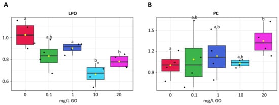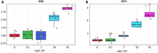 GSTs activity at 0.1 mg/L GO remained similar to the control, but significant increases were observed at 1, 10, and 20 mg/L (Figure 4B). The highest concentration of GO evidenced the highest induction of GSTs activity (434%).