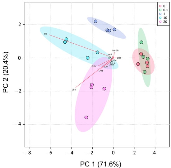 Principal Component Analysis (PCA) of biochemical changes induced by GO (0 mg/L, 0.1 mg/L, 1 mg/L, 10 mg/L, and 20 mg/L) in biofilms. Pearson correlation vectors were imposed: lipid peroxidation (LPO); protein carbonylation (PC); protein (PROT); lipids (Lip); intracellular carbohydrates (intra Ch); exopolysaccharides (EPSs); superoxide dismutase activity (SOD); glutathione S-transferases (GSTs); chlorophyll a (Chl a); chlorophyll b (Chl b); chlorophyll c (Chl c); fucoxanthin (Fuc); carotenoids (Carot).