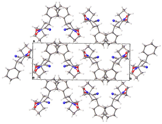 Finally, the X-ray single crystal diffraction experiment revealed a molecular and crystal structure of 8-cyano-9-phenyl-6-oxa-7-aza-spiro-[4.5]dec-7-ene 7-oxide 3c. The molecular geometry parameters are presented in the Supplementary Material. The compound crystallizes as colourless transparent prisms in a monoclinic P21/c space group. (Figure 1). The supramolecular structure is stabilized by hydrophobic interactions of phenyl and cyclopentane groups, while no hydrogen bonds or π-stacking were observed (Figure 2).
