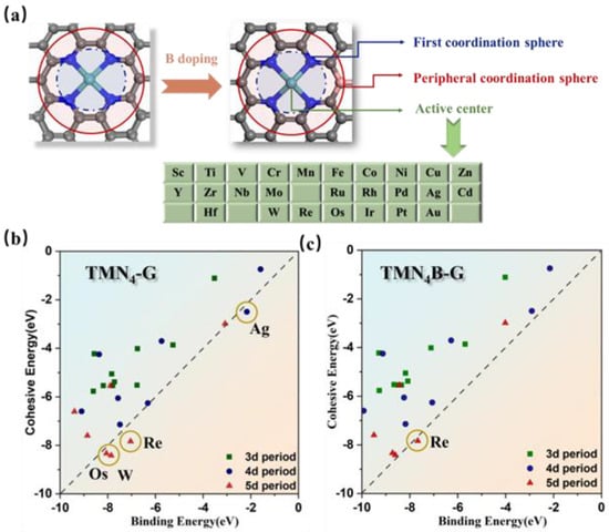 (a) The coordination environment of an N-doped graphene-supported single-atom catalyst before and after B doping. The cyan, blue, grey, and pink balls represent the transition metal, nitrogen, carbon, and boron atoms, respectively. The green table shows the 26 transition metals employed. Schematic diagrams comparing the binding and cohesive energies of TMN4−G (b) and TMN4B−G catalysts (c). The dashed line indicates that Eb is equal to Ec. Above the dashed line indicates that Eb − Ec < 0, i.e., the SACs are stable.