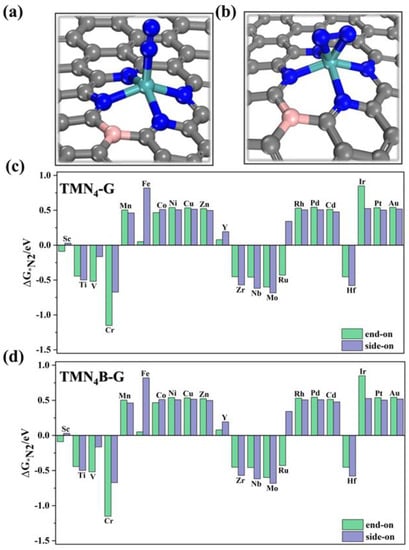 The structures of (a) end−on and (b) side−on adsorption configurations for N2. The cyan, blue, grey, and pink balls represent the transition metal, nitrogen, carbon, and boron atoms, respectively. (b) Schematic diagrams of the adsorption free energy (ΔG*N2) of N2 on TMN4−G (c) and TMN4B−G (d) catalysts for the end-on and side-on adsorption patterns.