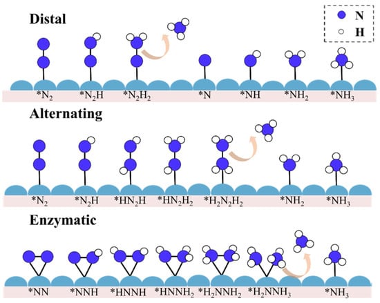 According to the two configurations of nitrogen adsorption, there are three reaction pathways for the NRR, namely the distal, alternating, and enzymatic mechanisms (Figure 3). When N2 is adsorbed in the end-on mode, there are two types of hydrogenation patterns, namely the distal and alternating mechanisms. For the distal mechanism, the first three hydrogenation processes occur on the distal N atom until the first ammonia molecule is formed and desorbed. The last three hydrogenations then take place on the remaining N atom to form a second ammonia molecule. The alternating mechanism works as follows: six H+/e− cycles alternate between the two N atoms, and two NH3 molecules are formed in sequence. When N2 is adsorbed following the side-on adsorption mode, the hydrogenation process alternates between the two N atoms, and two ammonia molecules are formed in turn. This reaction pathway is known as the enzymatic mechanism.