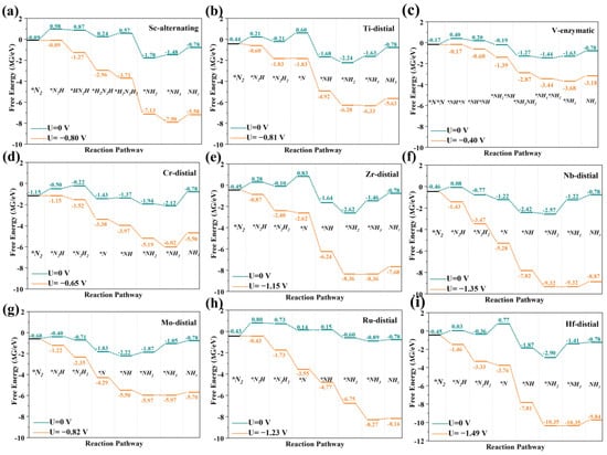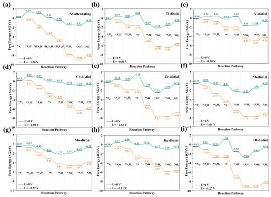 Previous studies have shown that, when ΔG*N2 is greater than 0 eV, the adsorption is weak, and it is difficult to proceed with the subsequent hydrogenation reaction [35,57,58,59]. An analysis of the free energy change in N2 adsorption of the SACs in Figure 2 showed that there were nine metals with a ΔG*N2 less than 0 eV, namely Sc, Ti, V, Cr, Zr, Nb, Mo, Ru, and Hf. In order to better explore the effect of B doping, we next also investigate the NRR performances of the above nine single-atom catalysts.