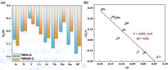 Therefore, we further investigated the relationship between the value of the change in the magnetic moment (Δμ = μTMN4B-G − μTNMN4-G) and the value of the change in the limiting potential of the optimal path (ΔUL = UL-TMN4B-G − UL-TMN4-G), as shown in Figure 6b. If ΔUL < 0, it meant that the UL of the catalyst was greater after doping with B atoms, i.e., the performance of the catalyst was better. This relationship is shown in Figure 6b, with the R2 equal to 0.83. It can be seen that the ΔUL increased as the Δμ decreased, indicating that the greater the μ of the central metal atom was reduced after B doping, the more positive the required limiting potential and the better the catalytic performance of the NRR. This finding provides insight to the design of better-performing NRR electrocatalysts by modulating the peripheral ligand environment.