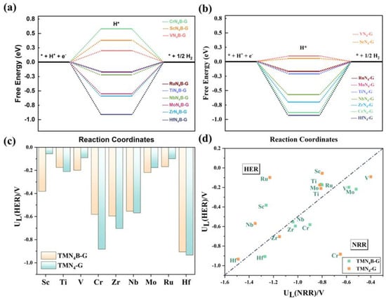 It is well known that the HER is the main competitive reaction for the NRR. A good NRR catalyst should not only have good NRR activity, but also high NRR selectivity, i.e., the HER reaction should be suppressed [59,62]. We calculated the Gibbs free energy diagrams of the HER for the SACs before and after doping with B atoms, as shown in Figure 7a,b, respectively. It can be seen from Figure 7c that ScN4−G, VN4−G, MoN4−G, and RuN4−G had more negative UL values for the HER after the introduction of B atoms, indicating that the HER process was suppressed. Before B doping, the HER proceeded more easily due to the moderate binding strength of hydrogen to the central atom on the surface of the TMN4-G catalysts (ScN4−G: ΔG*H = 0.06 eV, VN4−G: ΔG*H = 0.09 eV, MoN4−G: ΔG*H = −0.17 eV, and RuN4−G: ΔG*H = −0.10 eV), which was more favorable for hydrogen adsorption and desorption. However, with B doping, hydrogen species became difficult to adsorb or desorb on the surface of the TMN4B-G catalysts (ScN4B−G: ΔG*H = 0.38 eV, VN4B−G: ΔG*H = 0.19 eV, MoN4B-G: ΔG*H = −0.21 eV, and RuN4B-G: ΔG*H = −0.17 eV), resulting in the suppression of the HER. Finally, we evaluated the selectivity of the catalysts by comparing the difference between the UL(HER) and UL(NRR), i.e., if the difference between the UL(NRR) and UL(HER) of a catalyst was greater than −0.5 V (the benchmark for metallic catalysts) [63,64], the catalyst was more susceptible to the NRR. As shown in Figure 7d, SACs above the dashed line were more prone to HERs, while SACs below the dashed line had higher NRR selectivity. It can be seen that the introduction of B atoms generally increased the selectivity of the SACs. In particular, MoN4−G, NbN4−G, and HfN4-G tended to shift from HER to NRR after doping with B atoms.