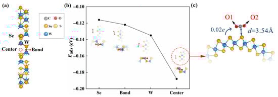 According to Equation (1), we obtained Eads values of various adsorption sites, which were used to explore the most stable adsorption configuration. As shown in Figure 1b, we found that the Eads arrived the smallest (−0.19 eV) when the adsorbed CO2 gas molecule was located at the center site, which was the most stable adsorption configuration. The small absolute value of Eads of this adsorption configuration revealed that the adsorption is physical adsorption (usually, eV [29,30,31,32]).