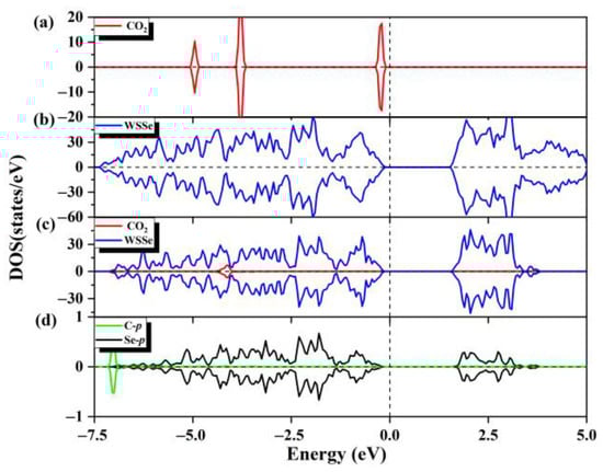 (a) The total state density of the pristine CO2 gas molecules and (b) the total state density of the pristine WSSe nanotube. (c) The partial state density of the adsorption system, where WSSe nanotube is shown in dark blue and CO2 is shown in red. (d) Partial state densities of the C p orbitals (cyan) of the adsorbed CO2 gas molecule and the Se p orbitals (black) of the Se atom most nearby the adsorbed CO2 molecule. Fermi level is expressed by the vertical dashed line.