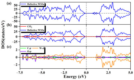 The total state density of WSSe nanotube with Se vacancy (a). The partial state density (b) of the adsorption system, the defective WSSe nanotubes are shown in dark blue, and CO2 is shown in red. (c) Partial state densities of adsorbed CO2 gas molecules in C p orbitals (cyan), O p orbitals (purple), and W d orbitals of two W atoms in substrate (orange). The vertical dashed line shows the Fermi level.
