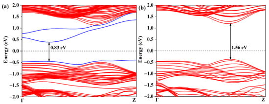 Band structures of (a) defective and (b) pristine Janus WSSe nanotubes. The gap states caused by the Se vacancy are marked with blue lines. The black number represents the value of band gap.