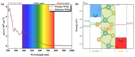 (a) Optical absorbance of pristine and defective Janus WSSe nanotubes. (b) Schematic diagram of band edge position of Janus WSSe nanotube relative to normal hydrogen electrode (NHE) at pH = 0. EAVS represents the energy level relative to the absolute vacuum scale (AVS). The pink arrow represents the orientation of the built-in electric field.