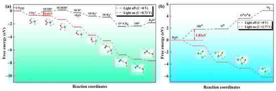 According to the free energy calculations mentioned above, it could be found that both the CO2RR and OER have endothermic steps; thus, they could not take place spontaneously without photo-irradiation. However, the high enough external potential supplied by the photo-excited carriers helps to overcome the Ul of these redox half-reactions, making the redox half-reactions proceed spontaneously [39]. The extra potential of the photogenerated electrons/holes (Ue/Uh) is defined as the energy difference between H+/H2 reduction potential and the CBM/VBM [18,39,40,41]. According to our previous work [27], the Ue and Uh of the defective Janus WSSe nanotube at pH = 0 are 0.73 and 2.77 V, respectively, which are sufficient enough to separately cover the Ul of CO2RR and OER. Therefore, in consideration of Ue and Uh, all the reduction and oxidation steps become downhill (red dash lines in Figure 7a,b). That is to say, under the light irradiation, both CO2RR and OER can operate spontaneously.