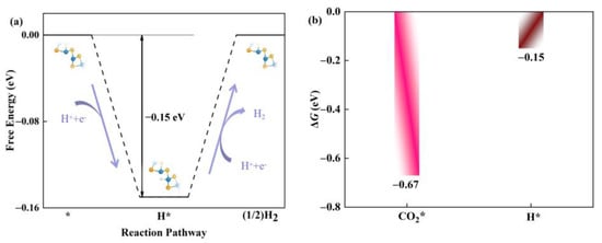 Usually, the hydrogen evolution reaction (HER) is considered to be an important competitive side reaction in the catalytic CO2RR [42,43]. Next, we investigated the competitive relationship between CO2RR and HER in the defective Janus WSSe nanotubes. Based on the Brønsted-Evans-Polanyi relation [44,45], the reaction with lower Gibbs, ΔG, values has a smaller reaction barrier; thus, it is more favorable for kinetics. Accordingly, the ΔG for H * formation energy (ΔGH*) is calculated (Figure 8a) and compared with the one for CO2 * formation energy (ΔGCO2*). As shown in Figure 8b, ΔGCO2* (−0.67 eV) is more negative than ΔGH* (−0.15 eV), which ensures that the active sites are preferred to be occupied by CO2 *. Therefore, the defective Janus WSSe nanotube is more selective for CO2RR over HER.