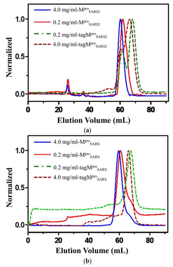 Gel filtration study of (a) MproSARS2 and tagMproSARS2 (tagMASMproSARS2LE6×His) and (b) MproSARS and tagMproSARS (tag34aaMproSARS). The solid line (Mpro) shows one peak corresponding to the dimer on the elution profile of gel filtration column chromatography. The dot-and-dash line (tagMpro) shows a major peak corresponding to the monomer. The Y-axis was normalized to the same height for better comparability.