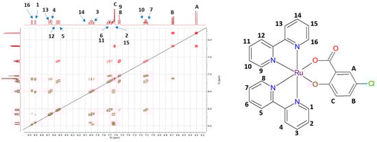 The 1H-NMR spectra of the complexes agree with the structure obtained from X-ray crystallography or with the predicted molecular structure (complex 6) and are shown in the supplementary information Figures S10–S17. Due to the fact that in the case of Complex 6, it was not possible to prepare a suitable crystal for X-ray analysis. The molecular structure was obtained using the 2D COSY NMR spectrum (Figure 1). Due to the coordination of the bipyridine ligand to the ruthenium(II) central atom, which leads to the asymmetric octahedral complex, we can observe peaks for every individual proton at different chemical shifts. As was published before [23], we assume that signals from protons that are closer to the carboxylic group of the salicylate ligand have higher chemical shifts. This observation confirms the octahedral geometry of all complexes in DMSO solution. It should also be noted at this point that the spectra were measured at least 24 h after the solutions were prepared. Based on 2D NMR the peak of H16 proton (with chemical shift 8.98 ppm) interact with H15, which is in overlapped multiplet with a chemical shift of 7.69 ppm and also with proton H14 (peak at 8.01 ppm). A very weak interaction is also observed with proton H13. Due to the symmetry of the complex, very similar interactions are observed for hydrogen H1 and protons H2, H3, and H4. The signal with a chemical shift of 8.55 ppm can be assigned to protons H5 and H12. Those protons interact with protons H7 and H6 (for H5) and H10 and H11 (for H12), respectively. There is no interaction with protons H8 and H9 (multiplet at 7.56 ppm), the assignment of which is based on interaction with other protons. The signals of the HA protons (6.32 ppm) are split by the HB protons (6.70 ppm), which still interact with the HC proton (multiplet at 7.69 ppm). Those peaks were assigned to the salicylate ligand.