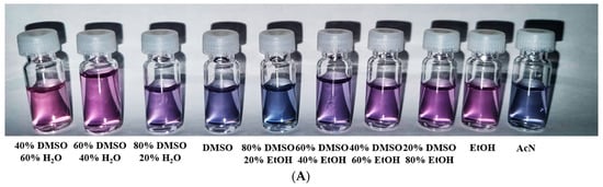 (A) The color of the solution of Complex 1 varies from blue to pink depending on the solvent used, (B) the measured electron spectra in different solvents, (C) the dependence of the wavelength of the band maxima in the UV–Vis spectra on the relative polarity of the solvent.