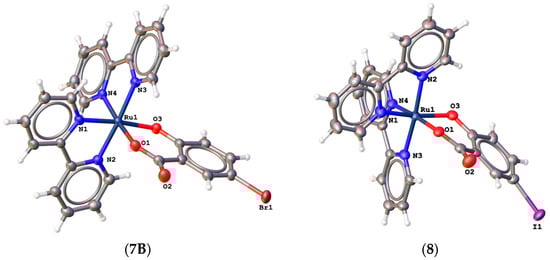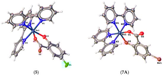 In the case of Complex 7, it was possible to solve the structure of two pseudopolymorphs (7A·1.75H2O and 7B·H2O·EtOH), which were obtained via the same procedure but crystallized from different volumes of mother liquor. The molecular structures of complexes 5·1.55H2O, 7A·1.75H2O, 7B·H2O·EtOH, and 8·4H2O are shown in Figure 4. Complex 5·1.55H2O crystallizes in a monoclinic system with space group P21/c, and both polymorphs—7A·1.75H2O and 7B·H2O·EtOH—crystallize in a triclinic system with space group P. As in the case of the previous four complexes, one salicylate ligand and two bipyridines are coordinated to one central ruthenium(II) atom, and the chromophore is thus {RuO2N4}.The lengths of the selected bonds are comparable to complexes containing a coordinated salicylate substituted at position 4. The selected bond lengths are shown in Table 4. The bond lengths between the ruthenium central atoms and the two oxygen donor atoms are in range from 2.053 Å to 2.091 Å. Bond lengths between ruthenium central atoms and nitrogen atoms in range from 2.000 Å to 2.055 Å. The same chromophore {RuO2N4} and salicylate ligand binding are observed in the complex molecule in the crystal structure of the complex [Ru(bipy)2(Sal)]·4H2O [31].