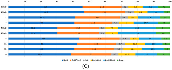 Hirshfeld 2D fingerprints were used to quantify the contribution of individual proximal contacts to the total surface area. In Figure 5C, the graph showing the individual contributions to the total surface area is shown. The close contacts with the largest proportion on the Hirshfeld surface are weak van der Waals H···H interactions. Very weak hydrogen bonds related to C···H/H···C close contacts cover from 23.1% to 25.9% of the surface. The stronger interactions are X···H/H···X hydrogen bonds (where X is a halogen atom), which make up 5.6–12.3% of the total surface. The proportions of O···H/H···O-type close contacts account for 9.6–23.6% of the surface, reflecting hydrogen bonds with the solvent molecules present. The proportions of C···C close contacts do not reflect the presence or absence of π···π stacking.