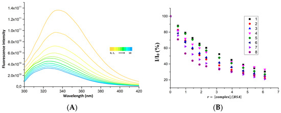 Albumin is the most abundant protein in vertebrate blood plasma (accounting for more than 60% of the total protein content of blood plasma). Studying the interaction of potential drugs with proteins present in blood is essential to elucidating the pharmacokinetics and pharmacodynamics of these agents [32]. Bovine serum albumin (BSA) was chosen as a model protein target since human serum albumin (HSA) showed marked instability in citrate and the TRIS buffer used in our experiments. The use of HSA would lead to significant errors and to an overestimation of the interaction ability of the studied substances. Due to the presence of tryptophan residues in the protein structure, BSA exhibits intense fluorescence, with a maximum at 336 nm (with our instrument setup and measurement conditions). The wavelength of the excitation radiation was 280 nm. All prepared complexes quenched the fluorescence of BSA, as can be observed in Figure 6B. The largest fluorescence quenching was caused by complex 8, which can also be observed in the changes in the fluorescence spectra in Figure 6A.