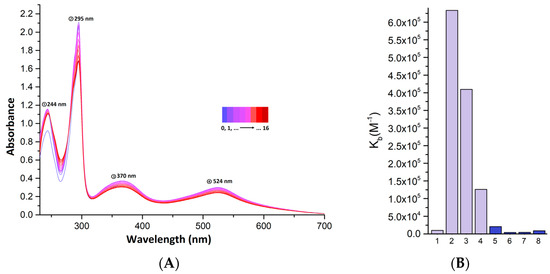 (A) changes in the electron spectra of Complex 2 upon addition of ct-DNA solution, (B) graphical comparison of binding constants for Complexes 1–8.