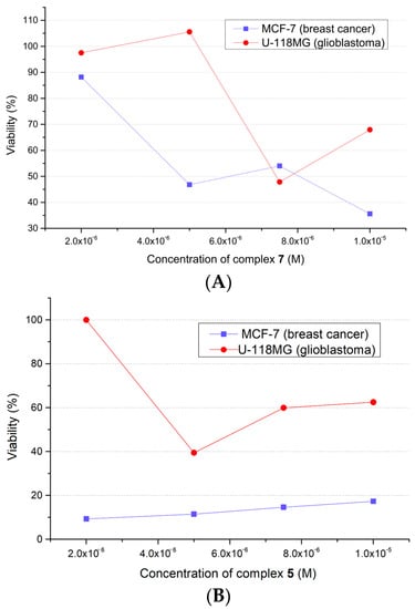 Graphical representation of viability of MCF-7 and U-118MG cells as a percentage after 24 h of incubation with Complexes 7 (A) and 5 (B).