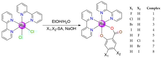 General procedure for the synthesis of complexes, The synthesis scheme is shown in the figure below (Figure 10). The precursor complex [Ru(bipy)2Cl2] (1 mmol, 1 equiv., 0.484 g) was dissolved in 50 cm3 of mixed solvent (ethanol:water—2:1 v:v). The second solution was prepared by dissolving a correspondent derivate of salicylic acid (1 mmol, 1 equiv.) in the same solvent and was subsequently neutralized with an excess of sodium hydroxide (2.3 mmol, 2.3 equiv., 0.092 g). The solutions thus prepared were mixed and allowed to reflux for three days. Subsequently, the reaction mixture was evaporated to dry using a rotary evaporator, and the product was purified via the column chromatography “dry-start method” using silica as the stationary phase and a mixture of acetonitrile and water (9:1, v:v) as the mobile phase. Single crystals suitable for X-ray crystallography were prepared via slow evaporation of solvent (ethanol:water—1:1, v:v).