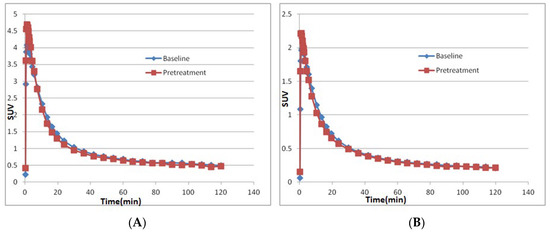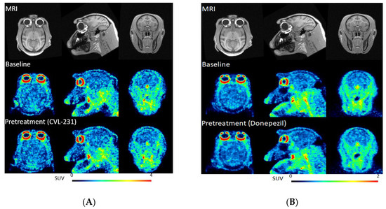 Time activity curves representing the concentration of total radioactivity in the NHP brain (A) at baseline and after pretreatment with CVL-231 (B) at baseline and after pretreatment with donepezil.