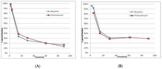 (A) The in vivo metabolism of [11C]PF06885190 is shown as the relative plasma composition at baseline condition and after pre-treatment with CVL-231) and (B) The in vivo metabolism of [11C]PF06885190 is shown as the relative plasma composition at baseline condition and after pre-treatment with donepezil.
