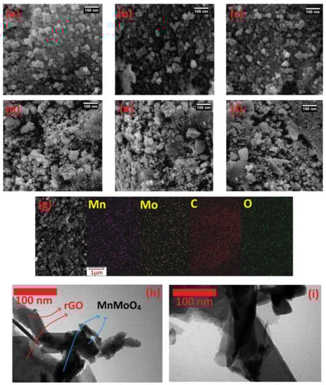SEM images of MnMoO4 (a–c), MnMoO4-rGO (d–f), and EDS mapping of MnMoO4–rGO (g). TEM images of MnMoO4-rGO (h,i).