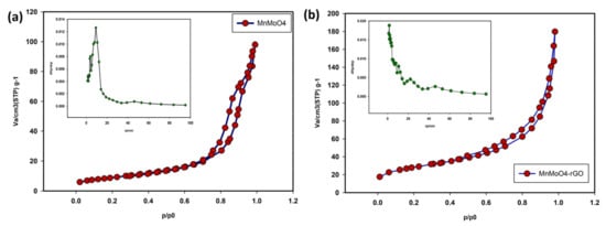 The specific surface area was investigated using the N2 adsorption–desorption. Figure 3a is related to the MnMoO4 sample, which, compared to the standard IUPAC isotherms, shows that the isotherm of the synthesized composite is type IV, and using the BET method, the effective surface area was also 57 m2/g. Moreover, using the BJH method (inset of Figure 3a), the average pore size for MnMoO4 was about 4.7 nm. BET and BJH diagrams at the standard temperature of 77 K for MnMoO4/rGO are also shown in Figure 3b. BET calculations show the specific surface area of about 78 m2/g and the average pore size is about 6.9 nm.