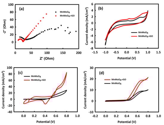 In general, catalysts based on metal oxides and without platinum have good activity in the oxidation of alcohols in an alkaline environment. The behavior of the electrodes modified with MnMoO4 and MnMoO4-rGO nanocatalysts was investigated in an alkaline medium 0.5 M KOH (potassium hydroxide) solution. Figure 4a,b show the behavior of these nanocatalysts in an alkaline environment investigated by electrochemical impedance spectroscopy (EIS) and cyclic voltammetry (CV). Nyquist plots formed from a quarterly circle in high frequency and a straight line in low frequency. The quarterly circle is related to charge transfer resistance and a straight line is related to Warburg impedance, indicating diffusion impedance. The values of charge transfer resistances (Rct) for MnMoO4 and MnMoO4-rGO are 26.52 and 15.74 Ω, respectively. In the CV analysis, it was observed that the capacitive and faradic current density for MnMoO4-rGO is higher than the current density of MnMoO4. Therefore, both analyses demonstrate the improvement of the catalyst performance by adding rGO, which facilitates the electrochemical processes by enhancing the electrochemically active surface area and increasing the electrical conductivity [,] in the MnMoO4-rGO catalyst.