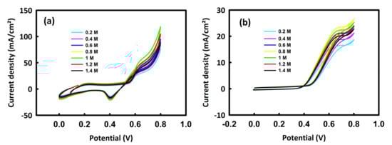 First, solutions containing 0.5 M KOH and different concentrations of methanol or ethanol were prepared. Figure 5a relates to the cyclic voltammetry of the nanocatalyst in different concentrations of methanol. As can be seen, with the increase in methanol concentration from 0.2 M to 1 M, the trend of peak current density is upward, and from this concentration onwards, a decrease in current density is seen. Figure 5b also shows the behavior of the MnMoO4-rGO nanocatalyst in different concentrations of ethanol. In the oxidation of ethanol, it can be seen that the peak current density has an upward trend up to the concentration of 0.8 M ethanol, and from this critical concentration onwards, a decrease in the anodic current density is seen. At critical concentrations of methanol and ethanol, the surface of the nanocatalyst is likely saturated and the electron transfer process is disturbed []. Moreover, the alcohol’s oxidation by-products may occupy the porosities of the catalyst, which, in turn, reduces the oxidation current density. In this way, the concentrations of 1 M methanol and 0.8 M ethanol are selected as the optimal concentrations to investigate the oxidation of methanol and ethanol by MnMoO4-rGO.