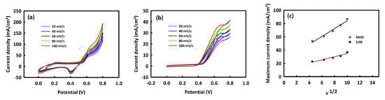 To study the electrocatalytic behavior of the catalyst for methanol and ethanol oxidation, CV analysis was performed at different scan rates in optimal concentrations of each of the alcohols. By increasing the scan rate, an increase in the anodic current density is seen in the process of methanol and ethanol oxidation (Figure 6a,b). The graph of the maximum current density according to the square root of the scan rate is shown in Figure 6c. There is a linear relationship between these two parameters with R2 = 0.972 and R2 = 0.958 for methanol and ethanol oxidation, respectively, indicating the diffusion-control mechanism in both processes.