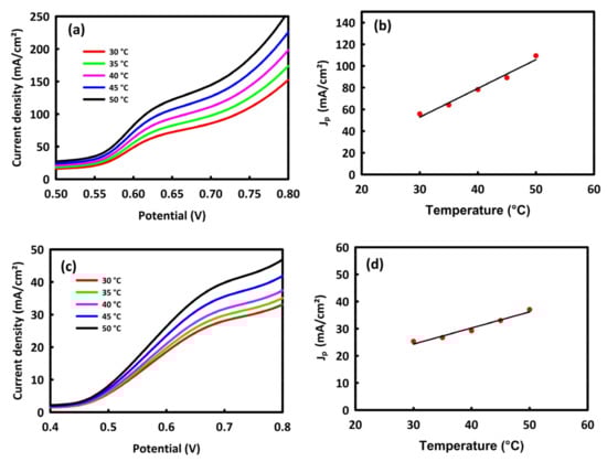 An increase in temperature is one of the parameters that facilitate the process of oxidation of alcohols and absorption of OH− in an alkaline environment. To investigate the effect of temperature on MOR and EOR processes from room temperature to 50 °C, linear sweep voltammetry (LSV) analyses of the nanocatalysts were performed at a scan rate of 40 mV/s (Figure 7a,c). From these figures, an increase in the anodic current density is observed with increasing temperature, which indicates the kinetic of alcohol oxidation is facilitated by increasing temperature. The temperature and the peak current density (Jp) have a linear relationship, which can be seen in Figure 7b,d.
