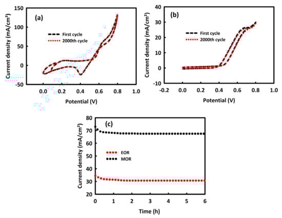 Two-thousand consecutive CV cycles in 0.5 M KOH/1 M methanol (a) and 0.5 M KOH/0.8 M ethanol (b) at a scan rate of 40 mV/s. chronoamperometry analysis in oxidation peak in 0.5 M KOH/1 M methanol and 0.5 M KOH/0.8 M ethanol (c).