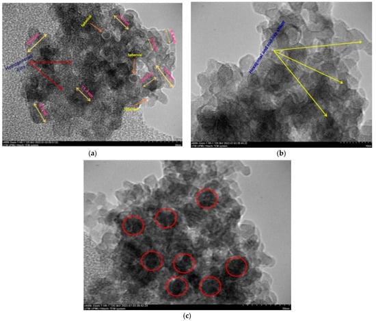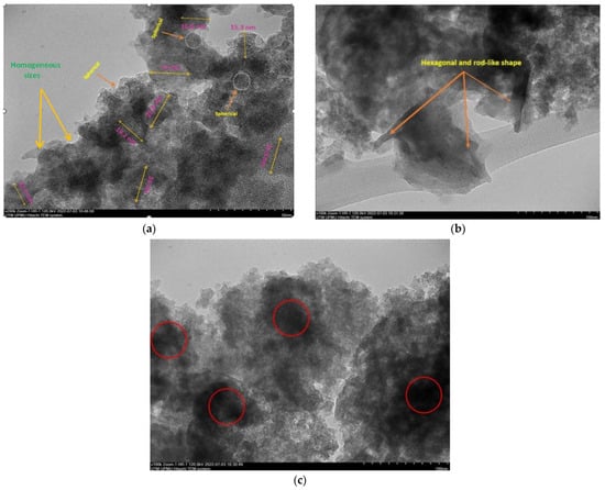 TEM images for PYNPs: (a) homogenous-sized particles, (b) hexagonal and rod-like shape, and (c) nucleation due to cavitation bubbles.