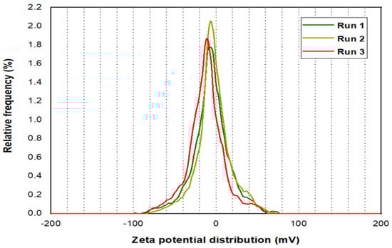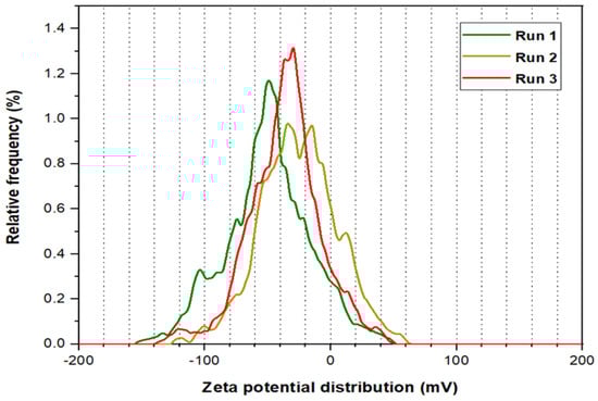 Three runs were processed for the Zeta potential analysis for PYNPs and CSNPs, as illustrated in Figure 5 and Figure 6, respectively. The mean Zeta potential for PYNPs was −43.9, −33.8, and −31.3 mV for the green, yellow, and red curves, respectively. This indicates that the stability of the particles was high enough that the nanoparticles did not aggregate [26,27]. This makes PYNPs suitable candidates for injection in the oilfield reservoirs. On the other hand, the mean Zeta potential for CSNPs obtained from the same instrument was −9.3, −10.3, and −12.4 mV for the same color combination (green, yellow, and red), as shown in Figure 6. This means that CSNPs were critically stable in water formation.