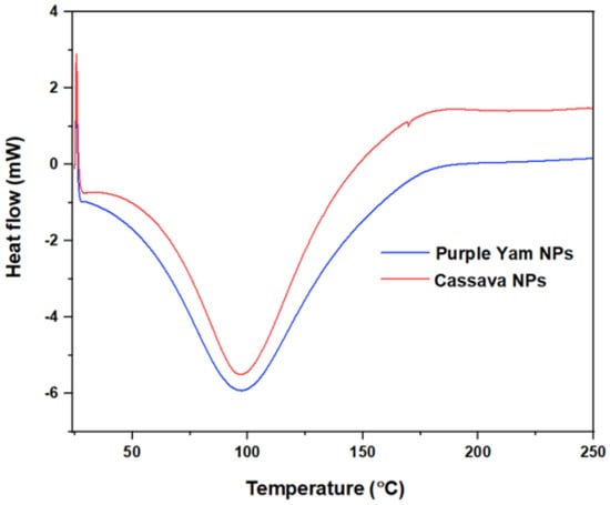 - Due to the sensitivity of the nano-polymers that were made from the starch extracted from purple yam and cassava, the crystallinity regions could interfere with the melting regions. For this reason, there was no distinguished region specialized for the melting part; therefore, the crystallinity temperature can be considered the same as the melting temperature, which was 97.6 °C for PYNPs and 97.8 °C for CSNPs, as seen from the curve.