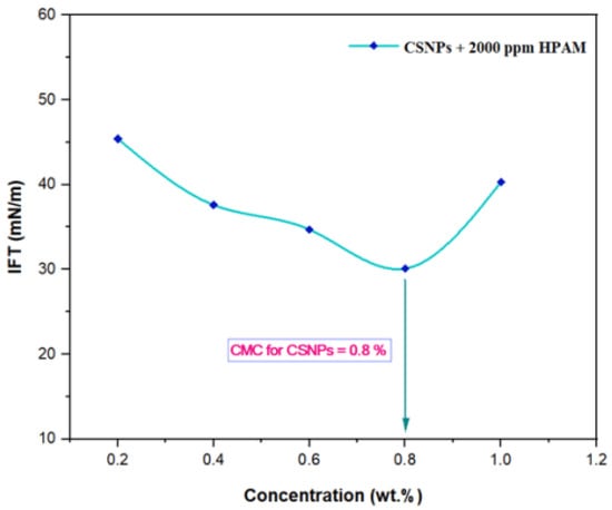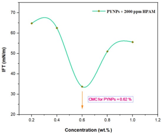 The IFT at 60 °C for PYNPs and CSNPs with HPAM is shown in Figure 9 and Figure 10, respectively. As seen from these figures, the IFT decreased with the increasing concentration of nanoparticles in the hybrid polymer, until it reached a minimum value at a certain (critical) concentration, from which further increasing the concentration of the nanoparticles in the hybrid polymer led to an increase of the IFT value [39]. This ‘critical’ value was 0.62 wt.% for PYNPs and 0.80 wt.% for CSNPs in the polymer solution.